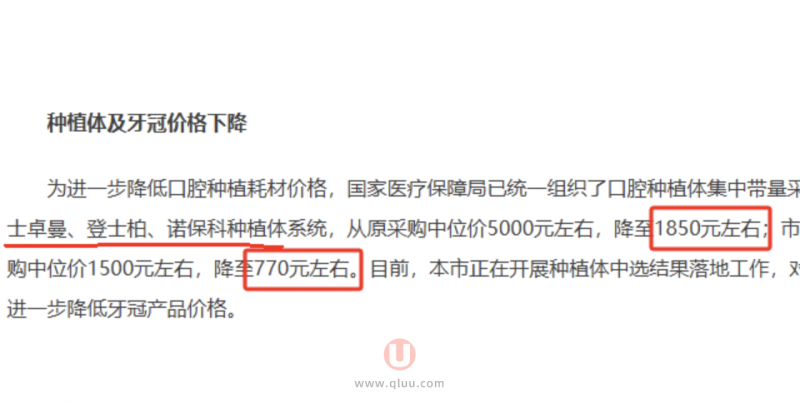 从2023年4月20日起,北京市口腔种植医疗服务费、种植体及牙冠价格将大幅降低,口腔种植医疗服务费较调整前平均下降72%。并且文中明确写清各品牌的价格上限:士卓曼、登士柏、诺保科种植体系统,从原采购中位价5000元左右,降至1850元左右;市场需求量最大的奥齿泰、登腾种植体系统,从原采购中位价1500元左右,降至770元左右。