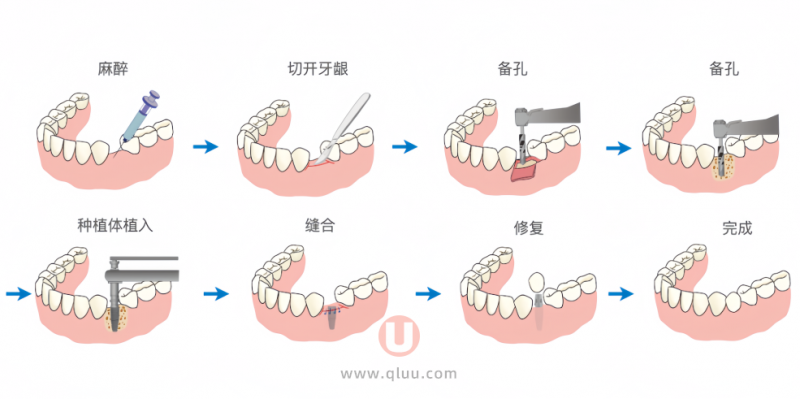 在确定好种植牙材料及价格,签署种植知情同意书后,可以开始种植手术。手术在局麻下进行,整个过程只会在注射麻药的一开始有一些轻微不适,麻药起效后的操作是不痛的。医生将在缺牙区域的牙槽骨上制备一个孔,然后将种植体植入其中,再将牙龈严密缝合,最后拍片确认种植体位置,一期手术就完成了。单颗牙种植手术全程大约在20分钟左右,种植完后需要等待种植牙与牙槽骨长好,时间根据骨头条件因人而异,最快在3个月左右。